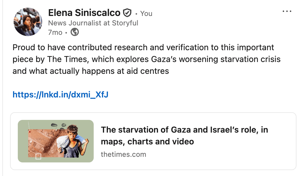 Storyful is a subscription-based journalism service, which means my work is not publicly available unless you’re a subscriber. You can find some examples of my verification work on my LinkedIn page here.